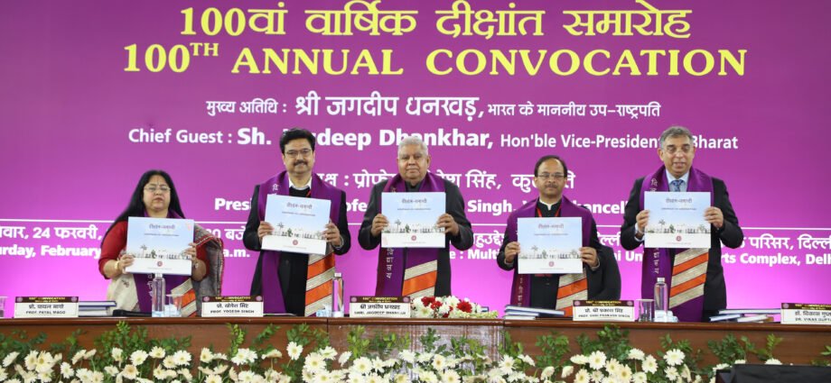 भारत के उप राष्ट्रपति जगदीप धनखड़ ने नव ग्रेजुएट विद्यार्थियों से कहा कि विकसित भारत@2047 की कुंजी आपके पास है, इसे अनलॉक करें। उप राष्ट्रपति दिल्ली विश्वविद्यालय के 100वें दीक्षांत समारोह में बतौर मुख्यातिथि संबोधित कर रहे थे। उन्होंने अपने विस्तृत भाषण में कहा कि गणतंत्र के 75वें साल में ये शताब्दी दीक्षांत समारोह सिर्फ एक समारोह से कहीं आगे है। यह आप सभी के लिए एक लॉन्च पैड है। यह कुछ हद तक श्रीहरिकोटा में इसरो रॉकेट लॉन्च पैड के समान है। यह सुरक्षित लॉन्च पैड आपको न केवल नई मंजिलों तक ले जाएगा, बल्कि इस विश्वविद्यालय में आपके द्वारा एकत्र किए गए अमृत से प्रेरित होकर नई ऊंचाइयों तक भी ले जाएगा। इस अवसर पर समारोह की अध्यक्षता दिल्ली विश्वविद्यालय के कुलपति प्रो. योगेश सिंह ने की। इस समारोह के दौरान 2022-23 में अपनी डिग्री पूरी करने वाले यूजी, पीजी व पीएचडी के 138020 और पीएचडी के 659 विद्यार्थी को डिग्री प्रदान की गई।