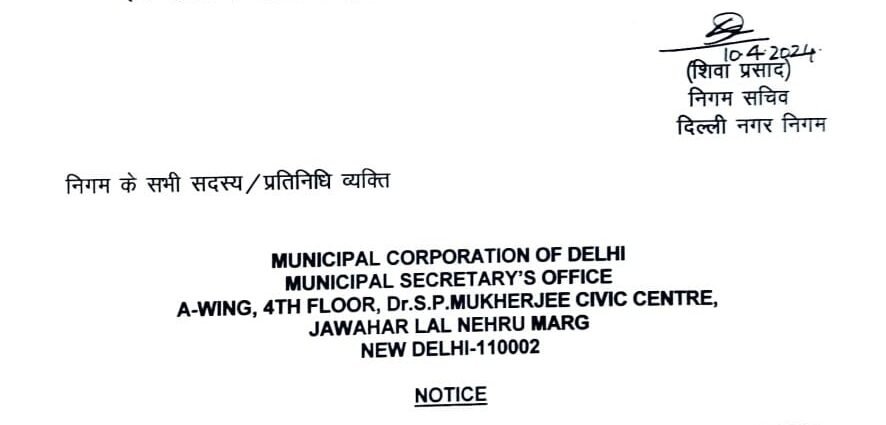 दिल्ली नगर निगम के महापौर एवं उपमहापौर का चुनाव दिल्ली नगर निगम की साधारण सभा की बैठक में किया जाएगा। महापौर एवं उपमहापौर के चुनाव के लिए दिल्ली नगर निगम की साधारण बैठक का आयोजन शुक्रवार 26 अप्रैल 2024 को सुबह 11:00 बजे अरुणा आसफ अली सभागार में किया जाएगा। चुनाव के लिए नामांकन दाखिल करने की अंतिम तिथि गुरुवार 18 अप्रैल 2024 है। इस संदर्भ में नामांकन निगम सचिव के कार्यालय में किसी भी कार्यदिवस में सुबह 11:00 बजे से शाम 5:00 बजे तक दाखिल किए जा सकते हैं। दिल्ली नगर निगम के महापौर का पद तीसरे वर्ष के लिए अनुसूचित जाति के लिए आरक्षित है।