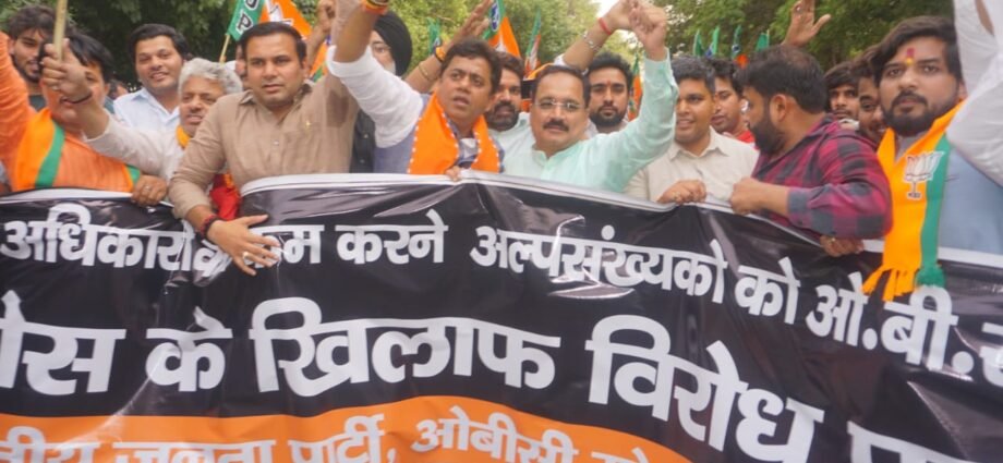 दिल्ली भाजपा अध्यक्ष वीरेंद्र सचदेवा और दिल्ली भाजपा ओबीसी मोर्चा अध्यक्ष सुनील यादव के नेतृत्व में आज कांग्रेस मुख्यालय के बाहर कांग्रेस द्वारा पिछड़ी जातियों का हक छीनकर मुस्लिम समुदाय को देने की चर्चा शुरू करने के विरूद्ध विरोध प्रदर्शन किया।