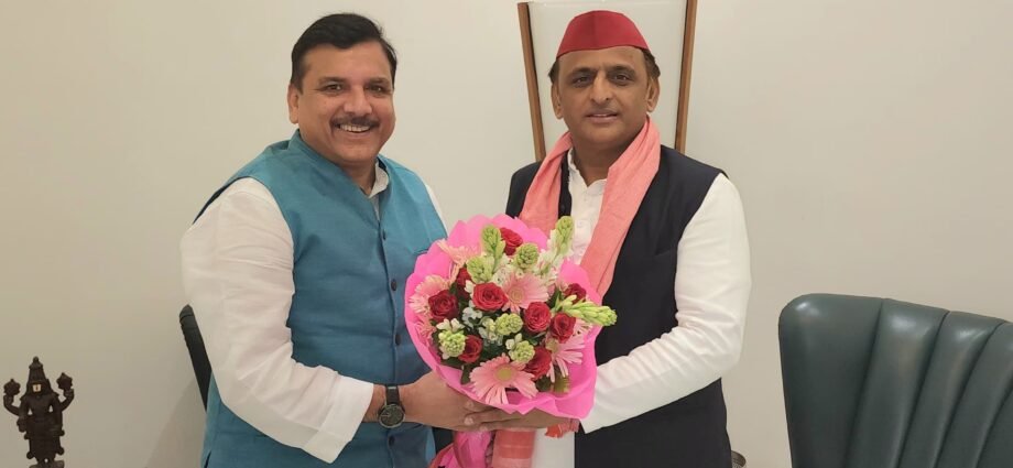 आम आदमी पार्टी के वरिष्ठ नेता एवं राज्यसभा सांसद संजय सिंह ने शनिवार को समाजवादी पार्टी के राष्ट्रीय अध्यक्ष अखिलेश यादव से उनके आवास पर मुलाक़ात की और उत्तर प्रदेश में इंडिया गठबंधन को मिली ऐतिहासिक जीत के लिए उन्हें बधाई दी। संजय सिंह ने कहा कि संविधान और आरक्षण की रक्षा के लिए आगे भी इंडिया गठबंधन के साथ मिलकर काम करेंगे। लोकसभा चुनाव में ‘‘आप’’ ने उत्तर प्रदेश में इंडिया गठबंधन को बिना शर्त समर्थन दिया था और सपा-कांग्रेस प्रत्याशियों के लिए चुनाव प्रचार किया था। गठबंधन के घटक दलों की संयुक्त मेहनत के चलते उत्तर प्रदेश में भाजपा को करारी हार का सामना करना पड़ा।