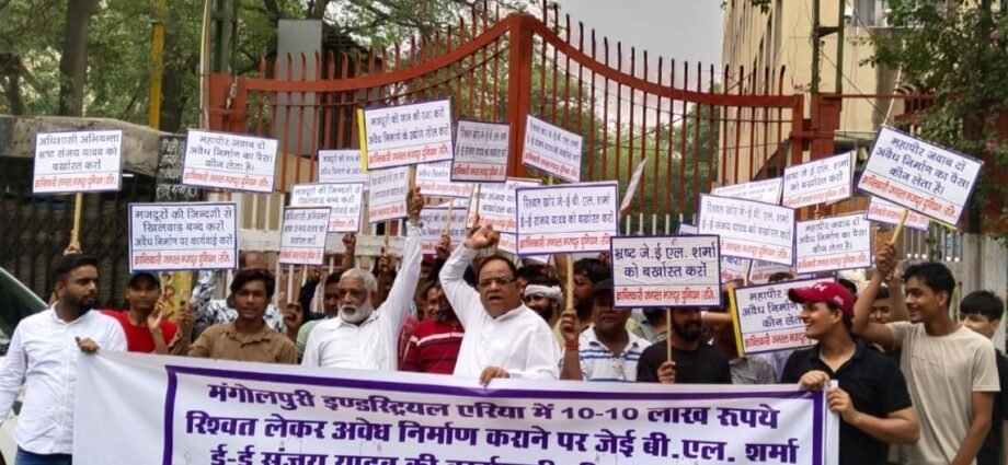 नई दिल्ली क्रांतिकारी जनरल मजदूरी यूनियन द्वारा आज मजदूरों की जिंदगी के साथ खिलवाड़ करते हुए नियम को ताक पर रख कर नगर निगम के अधिशासी अभियंता संजय यादव एवं जूनियर इंजीनियर बी एल शर्मा द्वारा खुला भ्रष्टाचार कर मंगोलपुरी इंडस्ट्रियल एरिया के अंदर 10 लाख रुपए रिश्वत लेकर 100% अवैध निर्माण करने के विरुद्ध भ्रष्ट अधिकारियों को बर्खास्त करने की मांग को लेकर रोहिणी जॉन कार्यालय पर यूनियन के अध्यक्ष कामता प्रसाद शर्मा एवं वरुण जाटव के नेतृत्व में के नेतृत्व में प्रदर्शन किया। प्रदर्शन कारियो को संबोधित करते हुए क्रांति जनरल मजदूर यूनियन के संरक्षक अश्वनी बागड़ी ने संबोधित करते हुए कहा कि जहां एक तरफ अरविंद केजरीवाल के पार्षद निगम में यह बात कहकर सत्ता में आए थे कि वह दिल्ली से लेंटर माफिया निगम के भ्रष्टाचार को समाप्त करेंगे परंतु बड़े दुख की बात है की जब से आम आदमी पार्टी निगम में काबिज हुई है तब से भवन विभाग द्वारा मकान बनाने में लेटर के लिए डबल कर दिए गए हैं तथा गरीब लोगों को नोटिस भेज कर एमसीडी दफ्तर बुलाकर धमकाया जाता है कि अगर मैं पैसे नहीं देंगे तो उनका मकान तोड़ दिया जाएगा 25 गज के मकानों को तोड़ा जा रहा है। इंडस्ट्रियल एरिया के अंदर जहां मात्र 60% बिल्डिंग बनाने की अनुमति है वहां 100% अवैध निर्माण किया जा रहा है फायर के नियमों का पालन नहीं हो रहा जिसके कारण आगजनी की घटना पर मजदूरों की जान जा रही है यूनियन द्वारा पिछले 4 महीनो से शिकायत करने के पश्चात कोई कार्यवाही नहीं हुई और अधिशासी अभियंता संजय यादव ने ग्रीवेंस विभाग में अपने जवाब में अवैध निर्माण की फैक्ट्री को वेद निर्माण करार देते हुए शिकायत को बंद कर दिया यह इस बात का प्रमाण है की नगर निगम के अधिकारी मोटी रिश्वत लेकर अवैध निर्माण को संरक्षण दे रहे हैं और निर्माण कार्यों से दिल्ली नगर निगम के अधिकारी अवैध उगाही करके यह पैसा महापौर तक पहुंचाते हैं जिसकी वजह से भ्रष्ट अधिकारियों को विरुद्ध कार्यवाही नहीं होती प्रदर्शनकारियों ने उपायुक्त निधि मालिक रोहिणी जॉन को ज्ञापन देने के लिए उनके कार्यालय पहुंचे परंतु उपायुक्त महोदय ने शिष्ट मंडल से बात तक करना उचित नहीं समझा और अधीक्षण अभियंता से मिलने श्री बैरवा से मिलने को कहा अधीक्षण अभियंता ने सिस्ट मंडल को आश्वासन दिया कि वह एक सप्ताह के भीतर इस मामले की जांच कर उचित कार्यवाही करेंगे जिस पर मजदूर यूनियन के अध्यक्ष कामता प्रसाद शर्मा ने बताया कि एक सप्ताह के भीतर अगर उनकी शिकायत पर कार्यवाही नहीं हुई तो वह एमसीडी