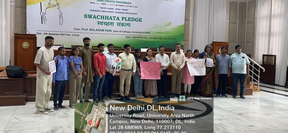 दिल्ली विश्वविद्यालय के अधिकारियों एवं कर्मचारियों ने डीन ऑफ कॉलेजेज़ प्रो. बलराम पाणी की अध्यक्षता में स्वच्छता का संकल्प लिया। इस अवसर पर उपस्थित लोगों को संबोधित करते हुए प्रो. बलराम पाणी ने कहा कि स्वच्छता के लिए थ्यूरिकल नहीं बल्कि प्रैक्टिकल कार्य की जरूरत है। उन्होंने कहा कि स्वच्छता हमारा निजी कर्तव्य है, जिसे हमें खुद निभाना होगा। हमें सबसे पहले अपने आसपास की स्वच्छता पर खुद ध्यान देना चाहिए।