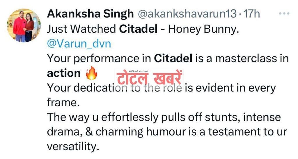 अपनी आकर्षक भूमिकाओं के लिए जाने जाने वाले वरुण धवन ने हाल ही में एक्शन से भरपूर श्रृंखला, सिटाडेल हनी बनी में अपने अभिनय कौशल का एक अलग पक्ष दिखाया है। राज और डीके द्वारा निर्देशित श्रृंखला ने अपनी रोमांचक कहानी और प्रभावशाली प्रदर्शन के लिए प्रशंसा बटोरी है।