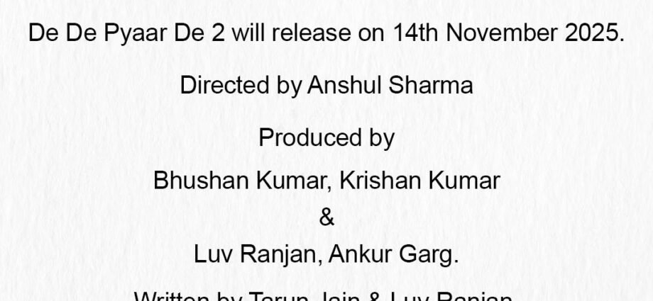 दे दे प्यार दे के निर्माताओं ने आधिकारिक तौर पर 14 नवंबर 2025 को अपने बहुप्रतीक्षित सीक्वल, दे दे प्यार दे 2 की रिलीज की तारीख की घोषणा की है। अजय देवगन, रकुल प्रीत सिंह और आर. माधवन अभिनीत यह रोमांटिक कॉमेडी एक रोमांचक कहानी का वादा करती है। हास्य, रोमांस और पारिवारिक ड्रामा से भरपूर।