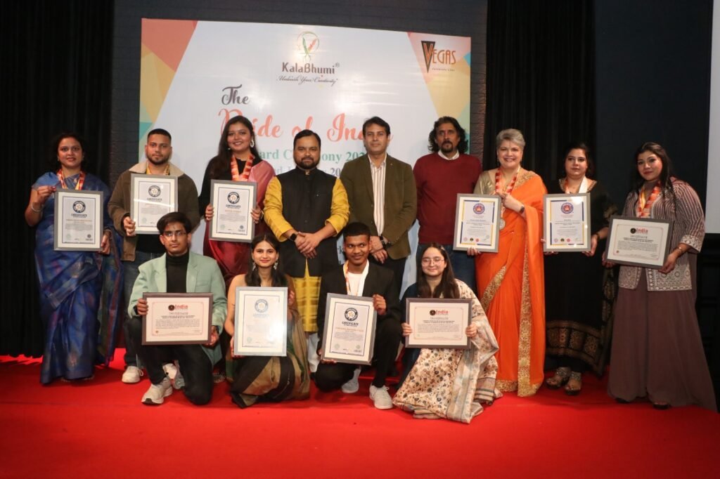 एशिया बुक ऑफ रिकॉर्ड्स, इंडिया बुक ऑफ रिकॉर्ड्स, हाई रेंज बुक ऑफ वर्ल्ड रिकॉर्ड्स, “द प्राइड ऑफ इंडिया“। अवॉर्ड सेरेमनी में सम्मानित हुए कलाकार। इस अवसर पर कलाभूमि इंस्टीट्यूट द्वारा सभी प्रतिभागियों को विशेष सम्मान से नवाज़ा गया। जिन्होंने इस ऐतिहासिक प्रयास में योगदान दिया, उनके नाम भी इन विश्व रिकॉर्ड बुक्स में अमर हो गए। इस भव्य आयोजन में देश की कई जानी-मानी हस्तियों ने अपनी उपस्थिति दर्ज कराईः-पद्मश्री जय प्रकाश लखिवाल- मिनिएचर आर्टिस्ट डॉ. संदीप मारवाह-फिल्म निर्माता, निर्देशक, पत्रकार एवं बिजनेसमैन, एशियन अकादमी ऑफ फिल्म एंड टेलीविज़न के संस्थापक, मुकेश सिन्हा-निदेशक, द्वारका सिटी न्यूज़पेपर, मोहम्मद ताहिर-डायरेक्टर, स्पोर्ट्स मैनेजमेंट प्रा. लि.,एनआरआई प्रमुख, नेशनल ह्यूमन राइट्स ऑर्गनाइज़ेशन, रॉबिन शर्मा-राष्ट्रीय महासचिव, अखिल भारतीय मंदिर परिषद, अमन शर्मा-वरिष्ठ उपाध्यक्ष, आूल द्वारका रेजिडेंट फेडरेशन। कलाभूमि इंस्टीट्यूट ऑफ फाइन आर्ट्स एंड डिज़ाइन 2007 से कला शिक्षा के क्षेत्र में सक्रिय है। अब तक इस संस्थान ने दस से अधिक विश्व रिकॉर्ड्स अपने नाम किए हैं, जिनमें लिम्का बुक ऑफ रिकॉर्ड्स, एशिया बुक ऑफ रिकॉर्ड्स, इंडिया बुक ऑफ रिकॉर्ड्स, हाई रेंज बुक ऑफ वर्ल्ड रिकॉर्ड्स, मार्वलस बुक ऑफ रिकॉर्ड्स शामिल हैं। कलाभूमि न केवल छात्रों को प्रदर्शनी, कलाकारों से मिलने, गैलरी विज़िट, सरकारी कला कार्यशालाओं में भाग लेने का अवसर देता है, बल्कि वर्ल्ड रिकॉर्ड्स बनाने जैसी बड़ी उपलब्धियों में भी शामिल करता है।