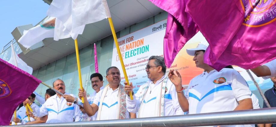 केंद्रीय शिक्षा मंत्री धर्मेन्द्र प्रधान ने कहा कि अगर 2047 तक भारत को विकसित राष्ट्र एवं दुनिया की महाशक्ति बनना है तो देश एवं राज्यों में राजनीतिक स्थिरता जरूरी है। शिक्षा मंत्री दिल्ली विश्वविद्यालय में ‘एक राष्ट्र एक चुनाव’ दौड़ के अवसर पर बतौर मुख्यातिथि संबोधित कर रहे थे। इस दौड़ का आयोजन दिल्ली विश्वविद्यालय द्वारा बुधवार, 30 अप्रैल को डीयू के रग्बी स्टेडियम से किया गया था। इस अवसर पर दिल्ली की मुख्यमंत्री श्रीमति रेखा गुप्ता ने डीयू के विद्यार्थियों को दौड़ में शामिल होने के लिए बधाई दी। डीयू कुलपति प्रो. योगेश सिंह ने कार्यक्रम की अध्यक्षता करते हुए कहा कि दिल्ली विश्वविद्यालय ‘एक राष्ट्र एक चुनाव’ प्रोग्राम में महत्वपूर्ण भूमिका निभा रहा है। केंद्रीय शिक्षा मंत्री धर्मेन्द्र प्रधान, दिल्ली की मुख्यमंत्री श्रीमती रेखा गुप्ता, दिल्ली के शिक्षा मंत्री आशीष सूद और डीयू कुलपति प्रो. योगेश सिंह सहित सभी गणमान्य व्यक्तियों ने झंडे दिखा कर दौड़ को रवाना किया।