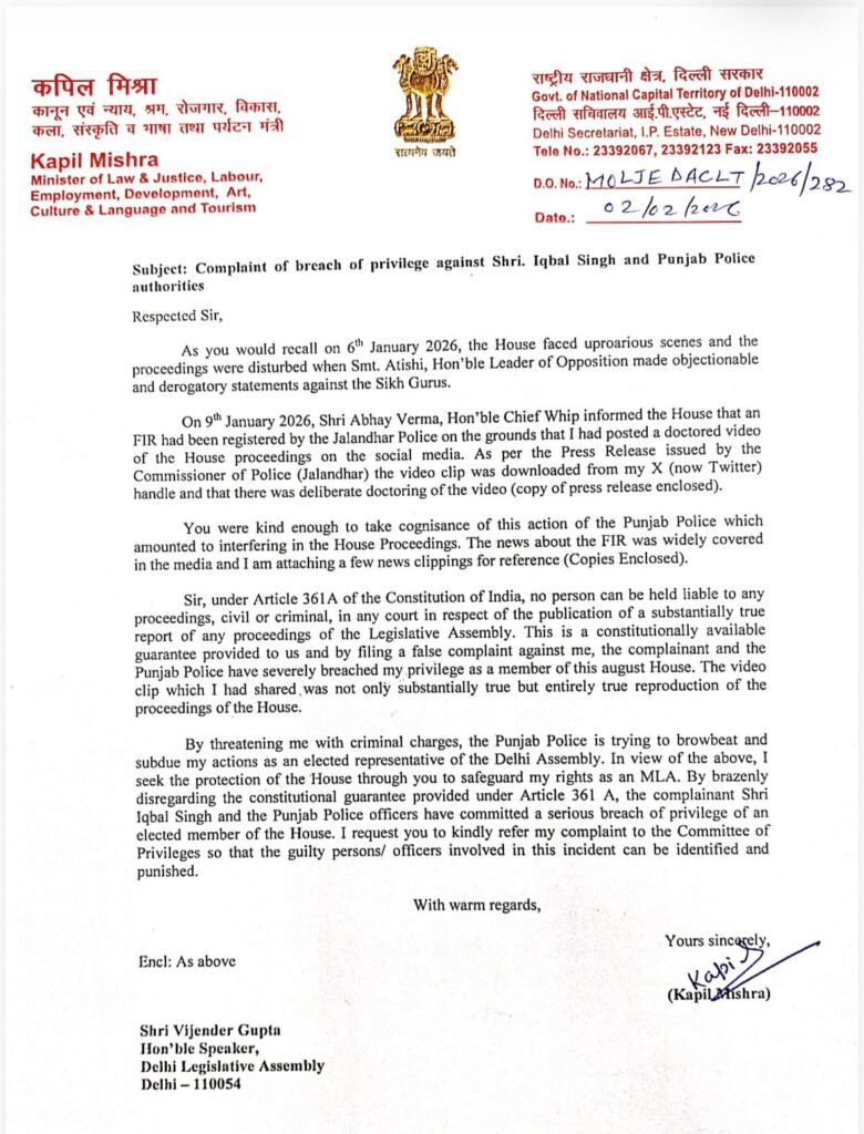 दिल्ली सरकार में विधि एवं न्याय, श्रम, रोजगार, विकास, कला, संस्कृति एवं भाषा तथा पर्यटन मंत्री श्री कपिल मिश्रा ने दिल्ली विधानसभा के माननीय अध्यक्ष श्री विजेंद्र गुप्ता को एक पत्र लिखकर अवगत कराया है कि श्री इकबाल सिंह द्वारा की गई शिकायत तथा उसके आधार पर पंजाब पुलिस द्वारा दर्ज एफआईआर सहित की गई कार्रवाई संविधान के अनुच्छेद 361A के अंतर्गत संवैधानिक संरक्षण की अवहेलना है तथा यह विधानसभा के विशेषाधिकारों का गंभीर उल्लंघन है।
